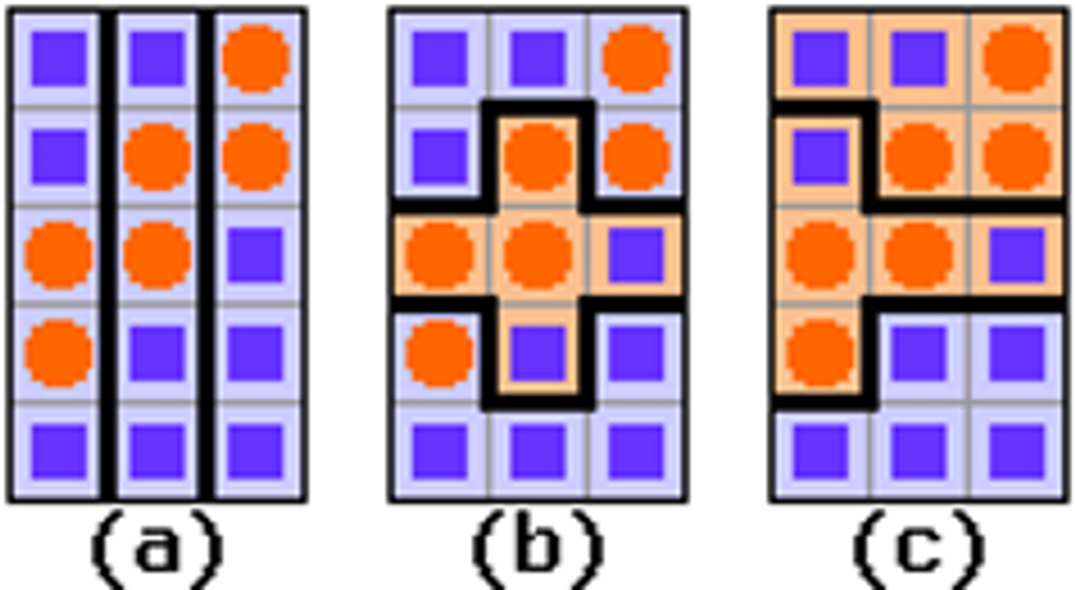 Depending on how the three districts in this example are broken up, there can be a 3:0 or a 2:1 win for the blue party, or even a 2:1 win for the orange party.