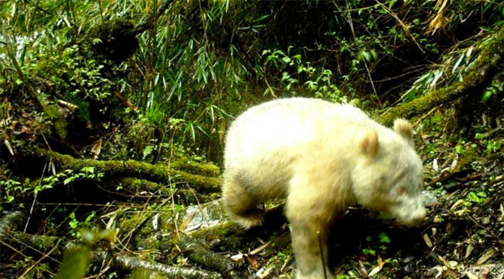 The spotless, red-eyed animal was photographed while trekking through the forest mid-April in southwestern Sichuan province, said official news agency Xinhua on Saturday.