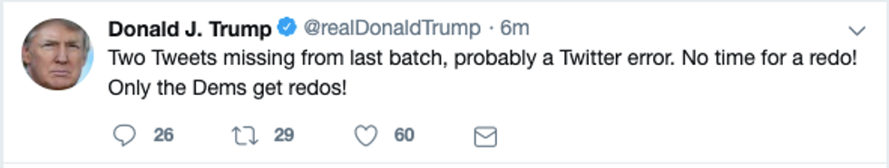 "Two Tweets missing from last batch, probably a Twitter error," the president grumbled. "No time for a redo! Only the Dems get redos!"
