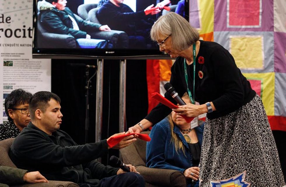 Chief Commissioner Marion Buller gives Paul Tuccaro an eagle feather after he gave testimony at the National Inquiry into Missing and Murdered Indigenous Women and Girls, in Edmonton, in November 2017. Tuccaro’s sister Amber Tuccaro went missing in 2010.