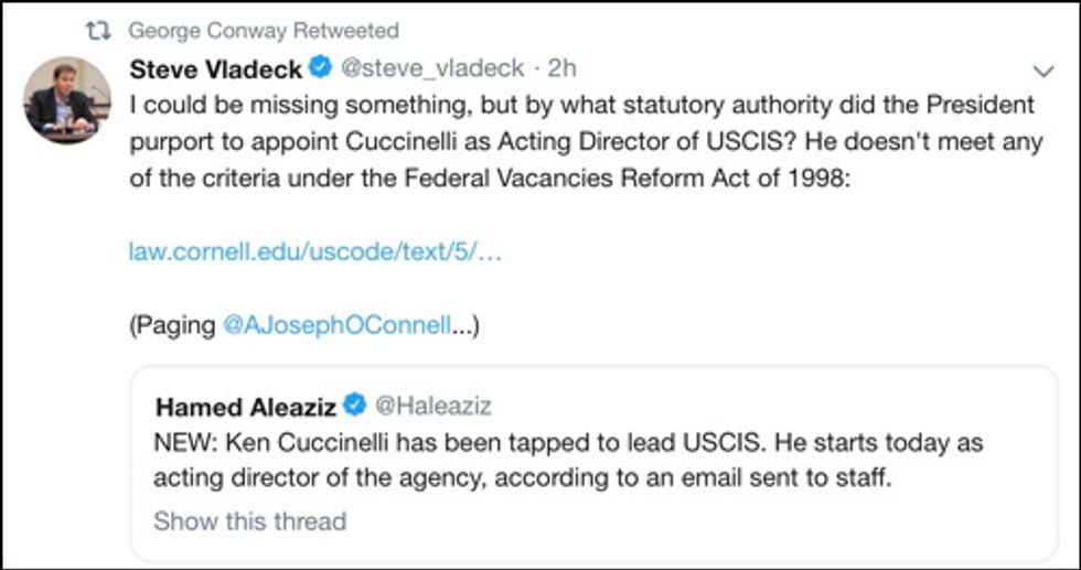Stephen Vladeck, Professor of Law at the University of Texas School of Law is also calling in to question the legality of the appointment. He took to Twitter to make his case, saying Cuccinelli "doesn't meet any of the criteria under the Federal Vacancies Reform Act of 1998."