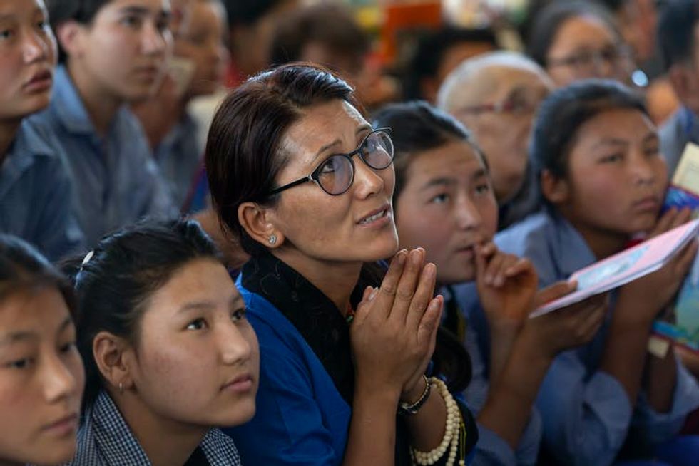 Exiled Tibetans listen to their spiritual leader the Dalai Lama, at the Tsuglakhang temple in Dharmsala, India.