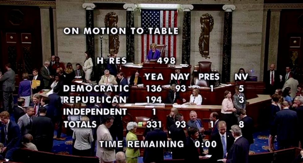 The U.S. House of Representatives by a wide margin just voted to not take action on a resolution to consider impeaching President Donald Trump over his racist remarks. The forced vote, which is still ongoing, currently stands at 331 in favor of "tabling," or putting aside, the motion, and 93 voting against tabling, meaning 93 voting to consider the motion.