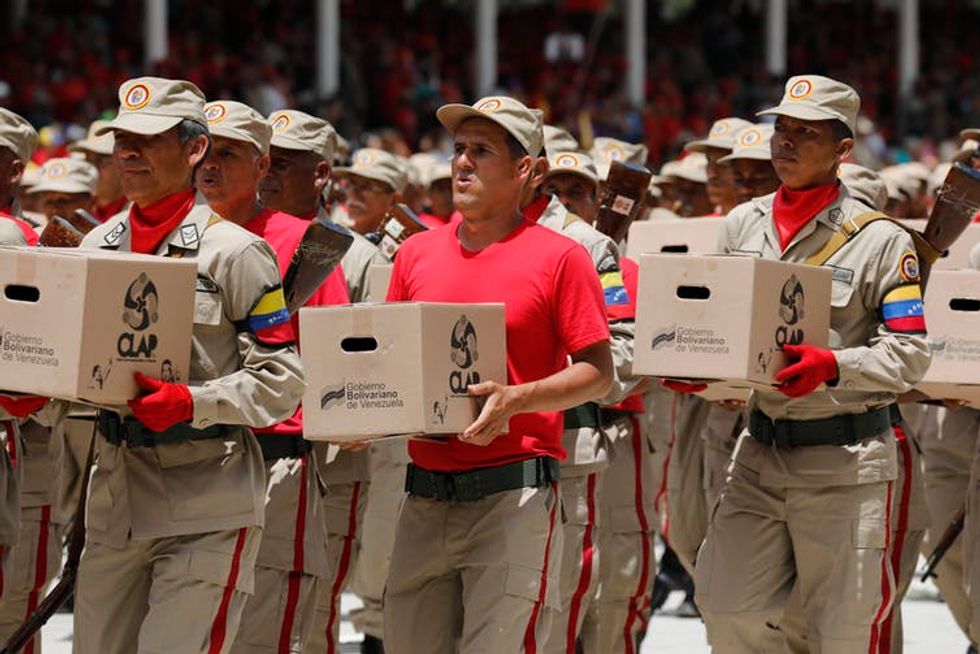 Venezuelan National Militia members carry boxes of subsidized food for distribution across the capital of Caracas, July 5, 2019.