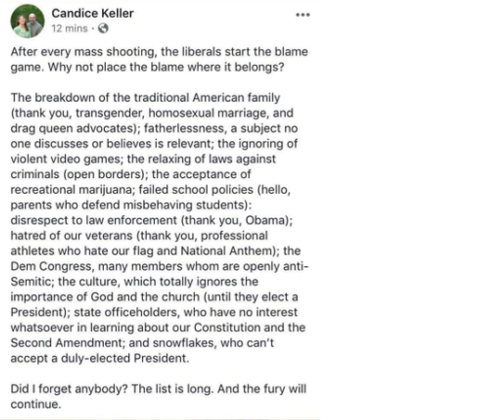The Cincinnati Enquirer reports that Ohio state Rep. Candice Keller posted an unhinged Facebook rant shortly after the mass shooting in Dayton, Ohio that sought to blame everything but easy access to firearms for the latest massacre of American citizens.