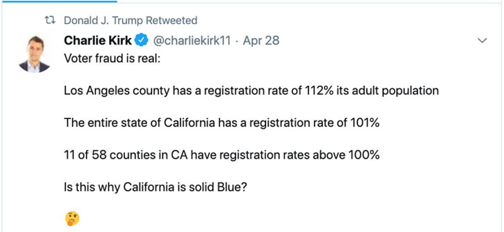 "Los Angeles county has a registration rate of 112% its adult population," he claimed. "The entire state of California has a registration rate of 101%. 11 of 58 counties in CA have registration rates above 100%."