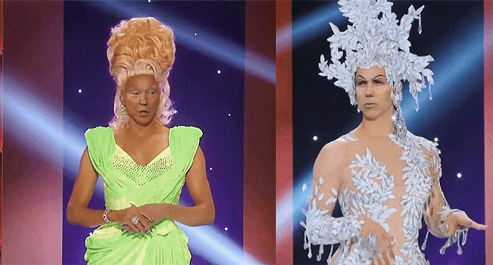 Using a video from "RuPaul's Drag Race," President Donald Trump and Vice President Mike Pence appear in a video, clad in stunning gowns before a cheering crowd of MAGA supporters.