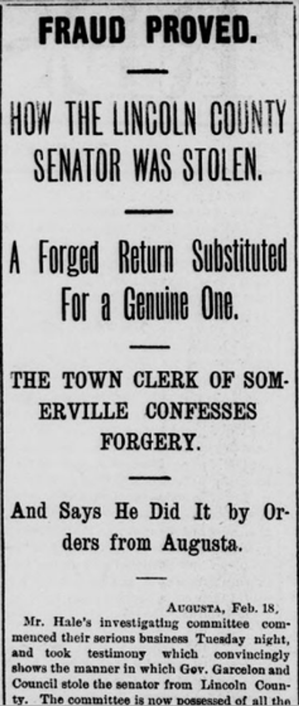 The Portland Daily Press of Dec. 24, 1879, covered a story about the charges that the legislative election was stolen by Garcelon and his allies.