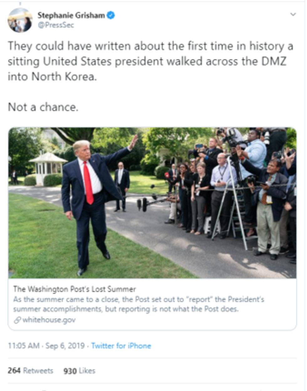 In complaining about the Post's press coverage of the president, Grisham wrote on Twitter that the Post "could have written about the first time in history a sitting United States president walked across the DMZ into North Korea" instead of writing articles about the president's diplomatic blunders with the Danish government, his racist attacks on Democratic congresswomen, or his bizarre decision to doctor a weather map to avoid being proven wrong about Hurricane Dorian striking Alabama.