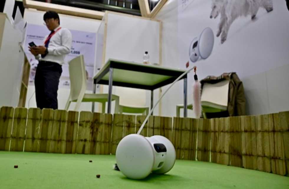 California start-up Varram showcased a Pet Fitness robot, which plays with cats and dogs at home via smartphone instructions, even dropping treats as a reward, while the owner is at work.