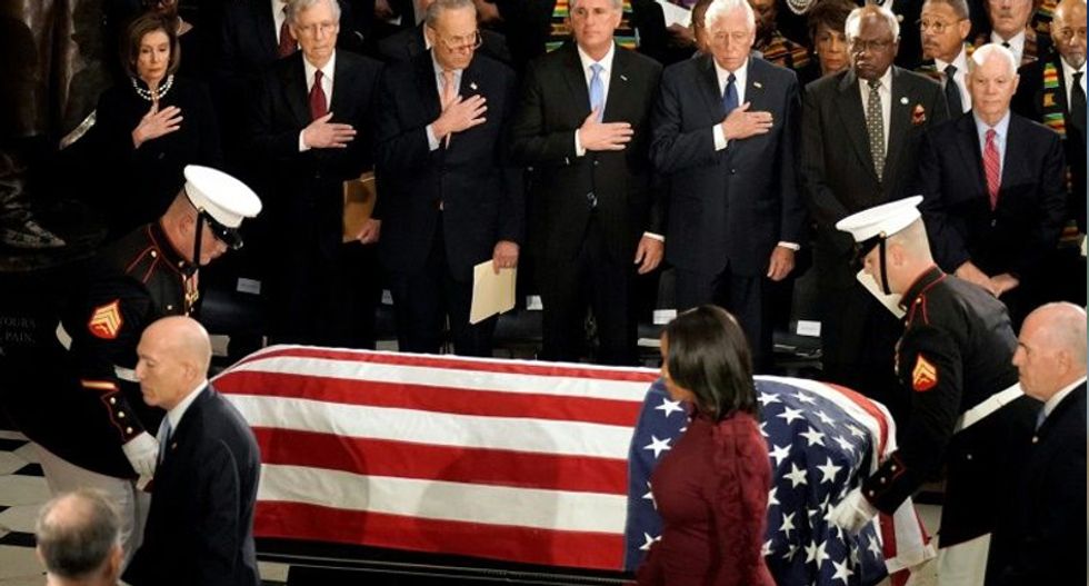 The flag-draped coffin lay in what is sometimes known as the Old Hall of the House, where Abraham Lincoln, responsible for abolishing slavery in the United States, served as a congressman before he became president. The hall now features a statue of civil rights icon Rosa Parks.