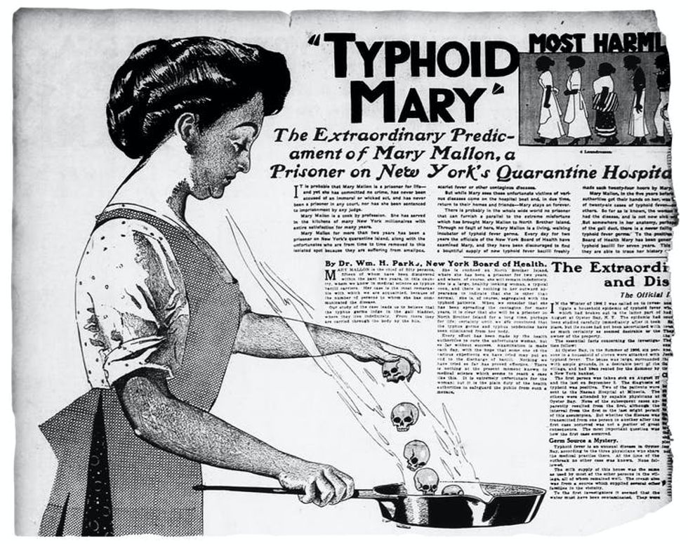In the United States, Irish immigrant Mary Mallon (who became known as “Typhoid Mary”) became the most prominent typhoid carrier to be detained after infecting the families she cooked for. Mallon was quarantined between 1907 and 1910 and again between 1915 and her death in 1936 after breaching the terms of her initial release and working as a cook under an assumed name.