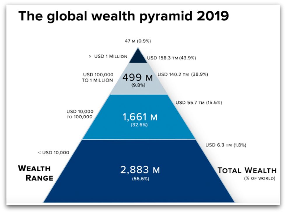 The millionaires of the world, who account for just 0.9 percent of the global population, now own nearly half of the planet's $361 trillion in wealth while the bottom 56 percent of the population owns just 1.8 percent.