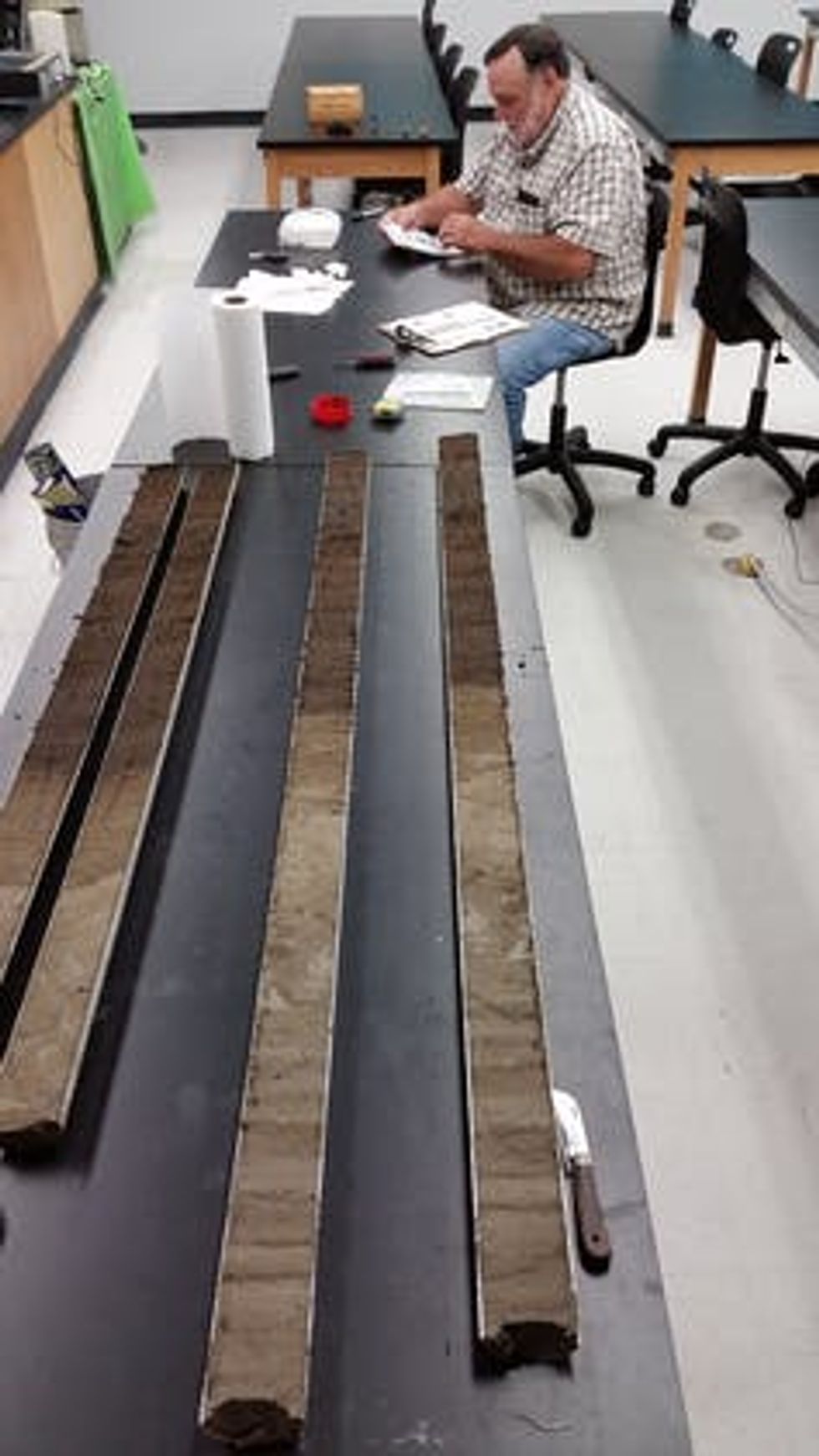 So in 2016, my colleagues and I extracted sediment from the bottom of White Pond. Using 4-meter-long tubes, we were able to preserve the order and integrity of the many sediment layers that have accumulated over the eons.