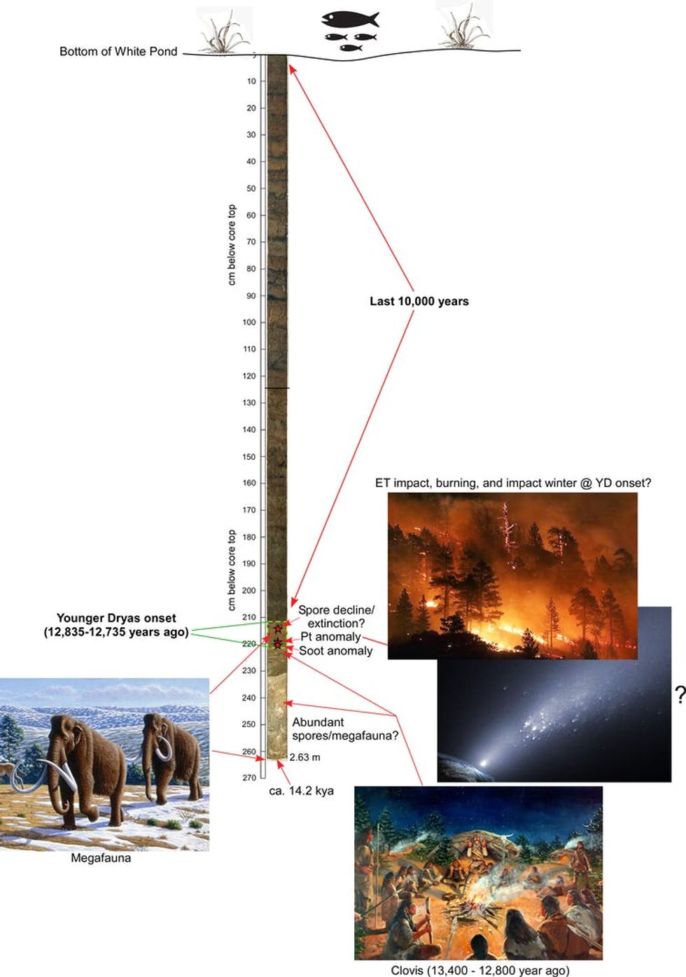 The data from White Pond are, however, consistent with the growing body of evidence that a comet or asteroid collision caused continent-scale environmental calamity 12,800 years ago, via vast burning and a brief impact winter. The climate change associated with the Younger Dryas, megafaunal extinctions and temporary declines or shifts in early Clovis hunter-gatherer populations in North America at this time may have their origins in space.