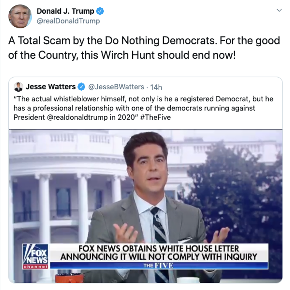 The president tweeted out a video clip Wednesday morning of Fox News host Jesse Watters arguing that the whistleblower complaint that touched off the impeachment inquiry was tainted by that intelligence official's professional ties to one of Trump's 2020 rivals.