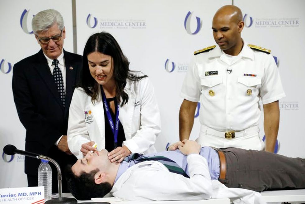 Surgeon General Jerome Adams, right, directs a session on naloxone administration, Jackson, Mississippi, May 17, 2018.