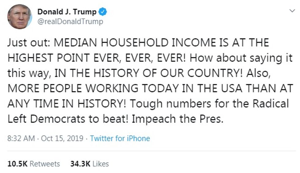 "MORE PEOPLE WORKING TODAY IN THE USA THAN AT ANY TIME IN HISTORY!" the president wrote. "Tough numbers for the Radical Left Democrats to beat! Impeach the Pres."