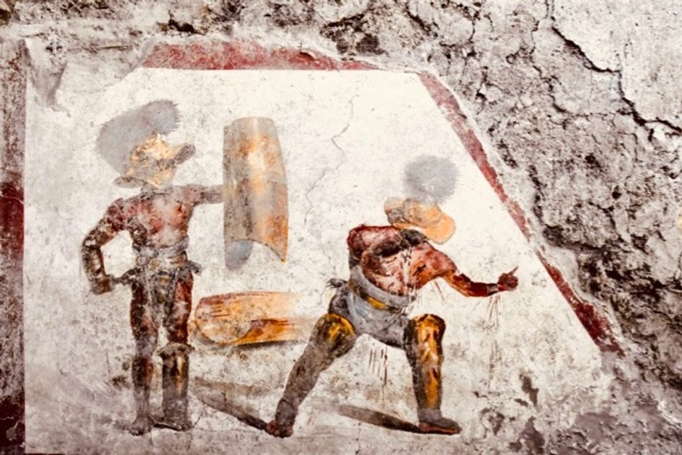 A vivid fresco depicting an armour-clad gladiator standing victorious as his wounded opponent stumbles gushing blood has been discovered in the ancient Roman city of Pompeii, Italy's culture ministry said Friday.