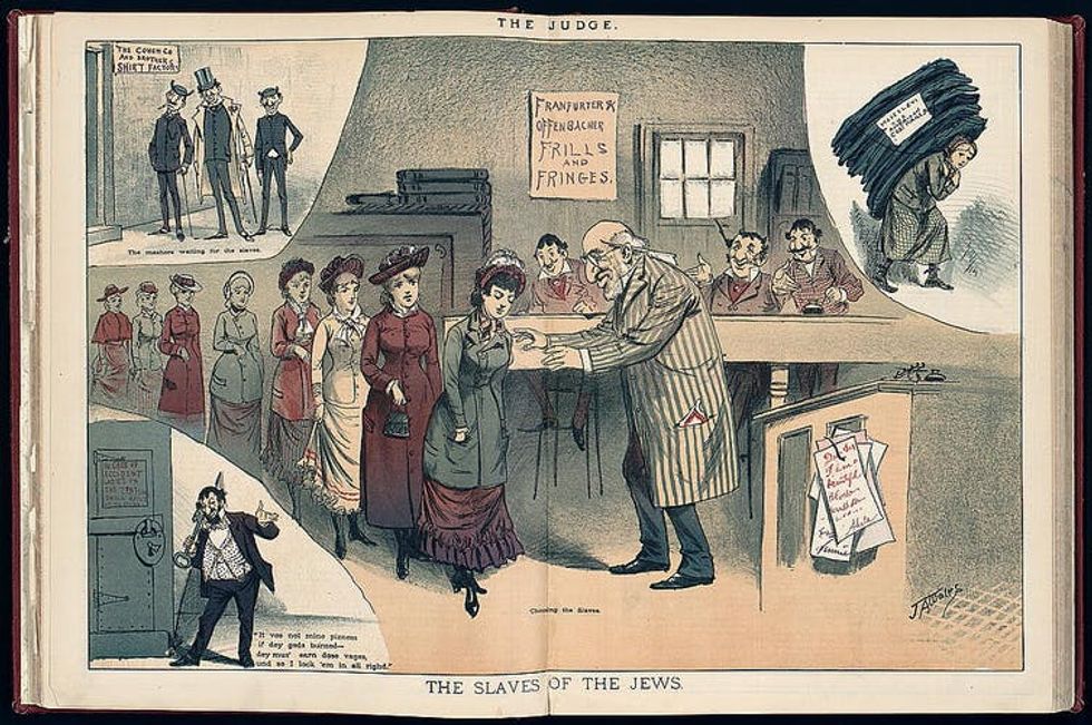 An illustration from the 1882 book, ‘Slaves of the Jews,’ showing a line of women, seeking employment, standing before a lecherous man who was obviously Jewish.