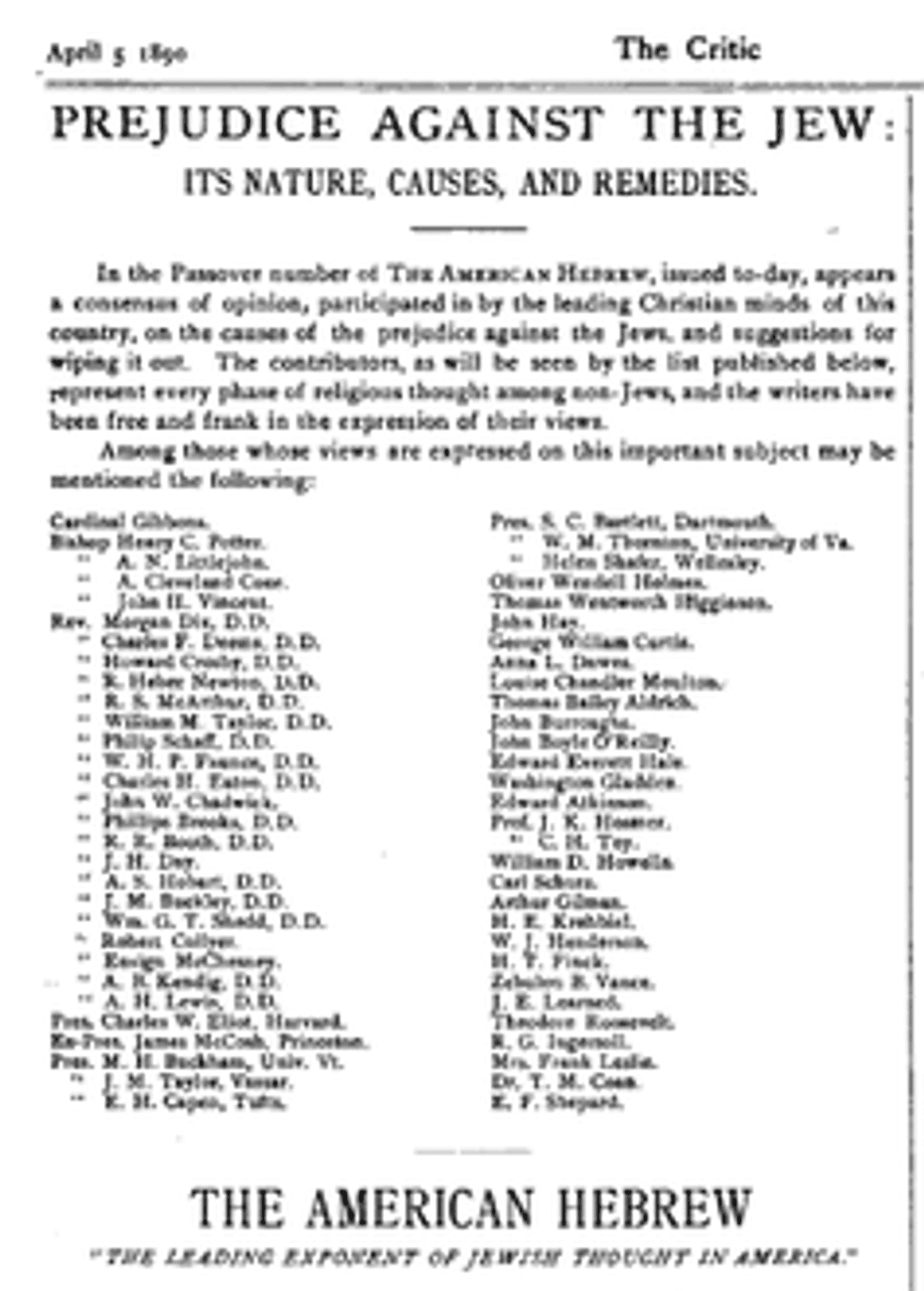 In 1890, observing a spike in anti-Semitism that saw Jews excluded from summer resorts, blackballed as members of private clubs and denied admission to private schools, the editors of the New York Jewish newspaper the American Hebrew asked more than 50 clergy, college presidents, lawyers and politicians about “Prejudices Against the Jews.” They then published the responses.