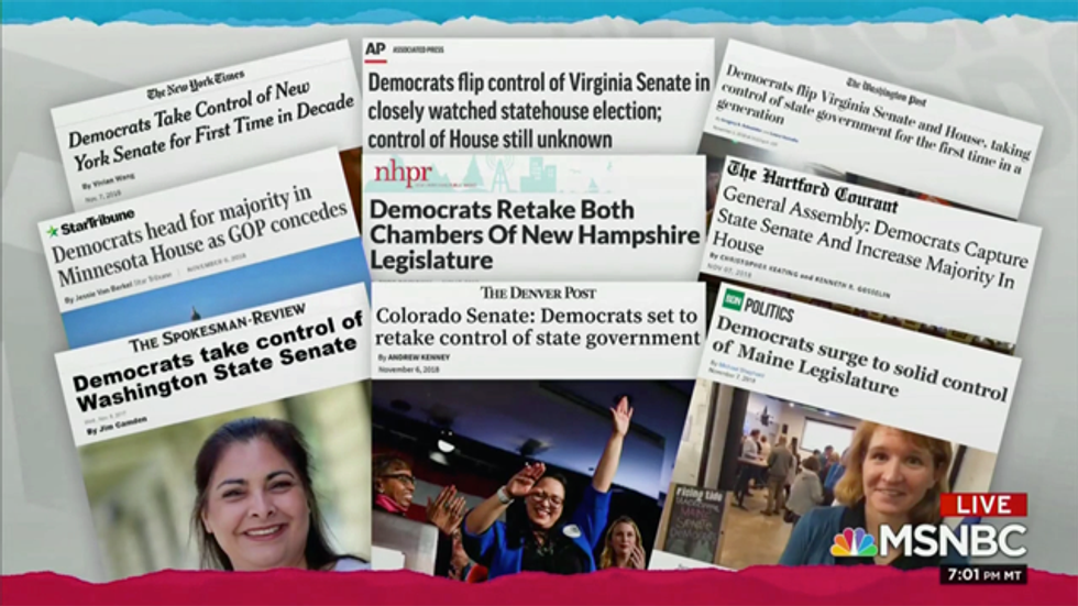 "The first one was in Washington State, the Senate there flipped from Republican control to Democratic control," she explained. "And then -- all on one night, election night 2018 -- the Colorado Senate flipped, the Maine Senate flipped, the Minnesota House flipped, the New Hampshire House flipped, the New Hampshire Senate flipped, the Connecticut Senate flipped and the New York Senate all flipped, and all of them flipped from Republican control to Democratic control," she noted.