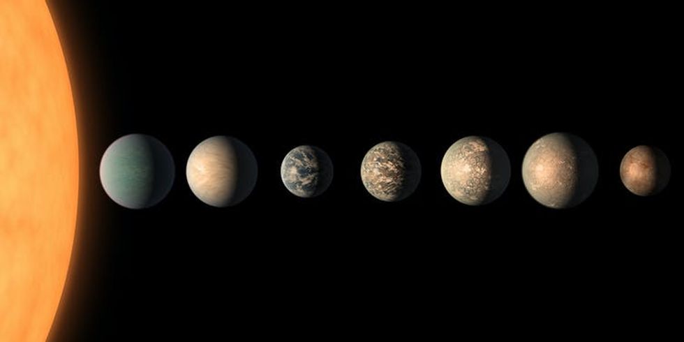This artist’s concept shows what the TRAPPIST-1 planetary system may look like, based on available data about the planets’ diameters, masses and distances from the host star, as of February 2018.