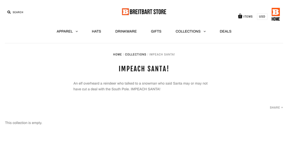 Screengrab showing Breitbart News site no longer selling "Impeach Santa" merchandise.[/caption]