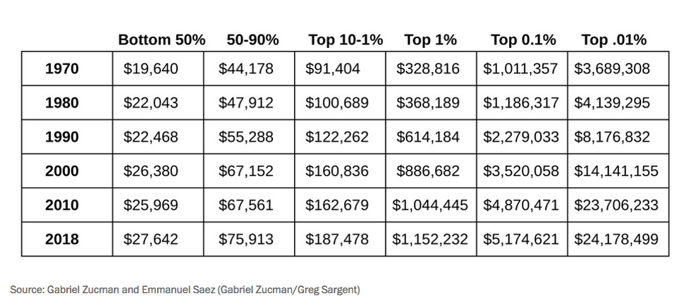 Zucman and fellow economist Emmanuel Saez, his co-author of the new book "The Triumph of Injustice," provided a chart showing how each group of earners' take-home pay has changed since 1970. The wealthiest Americans' assets skyrocketed by millions of dollars even in the first decade of the 21st century—when people in the bottom 50% saw their average take-home income decrease.