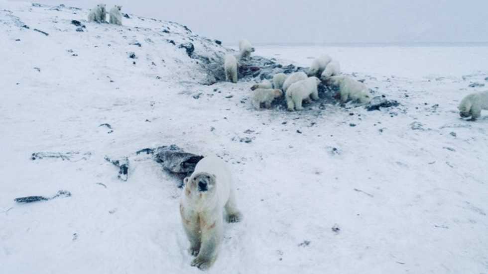 Polar bears regularly visit areas inhabited by humans in Arctic Russia to search for food, often in rubbish tips.