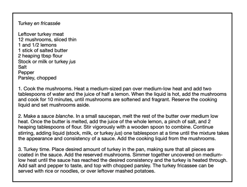 So this year, instead of scraping together another tiresome turkey sandwich, try a turkey recipe adapted from Alfred Suzanne’s “150 Ways to Accommodate Leftovers.”