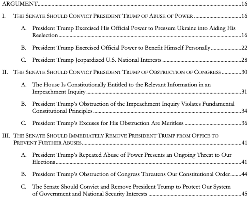 "The Senate should convict President Trump of obstruction of Congress," is the second section.
