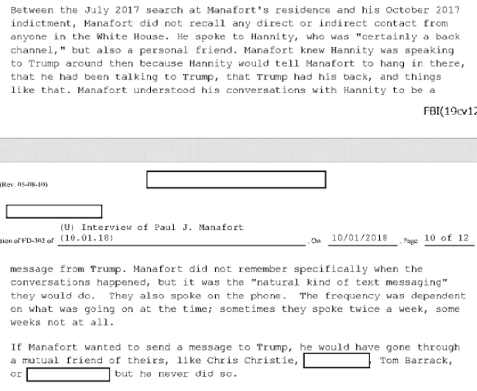 A key revelation in the new cache of documents released from former special counsel Robert Mueller's investigation summarizing FBI interviews with Trump officials concerned the president's former campaign manager Paul Manafort — who told FBI officials that he used Fox News talk show host Sean Hannity as a "back channel" to Trump while he was being investigated by federal agents.