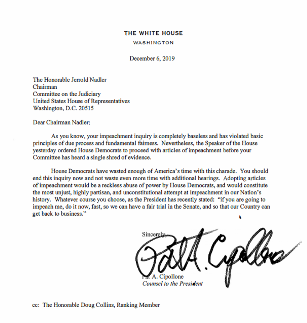 “Whatever course you choose, as the President has recently stated: ‘if you are going to impeach me, do it now, fast, so we can have a fair trial in the Senate, and so that our Country can get back to business,’” he wrote.
