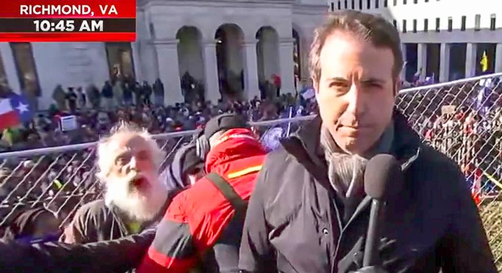 Onlooker interrupts NBC's Gabe Gutierrez as he reports from Second Amendment rally in Richmond, Virgnia (MSNBC/screen grab)