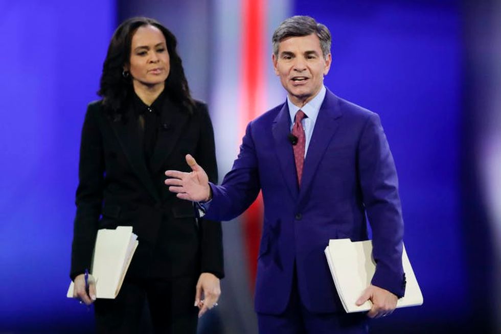 Stephanopoulos, right, gets ready to host the Democratic debate with Linsey Davis.