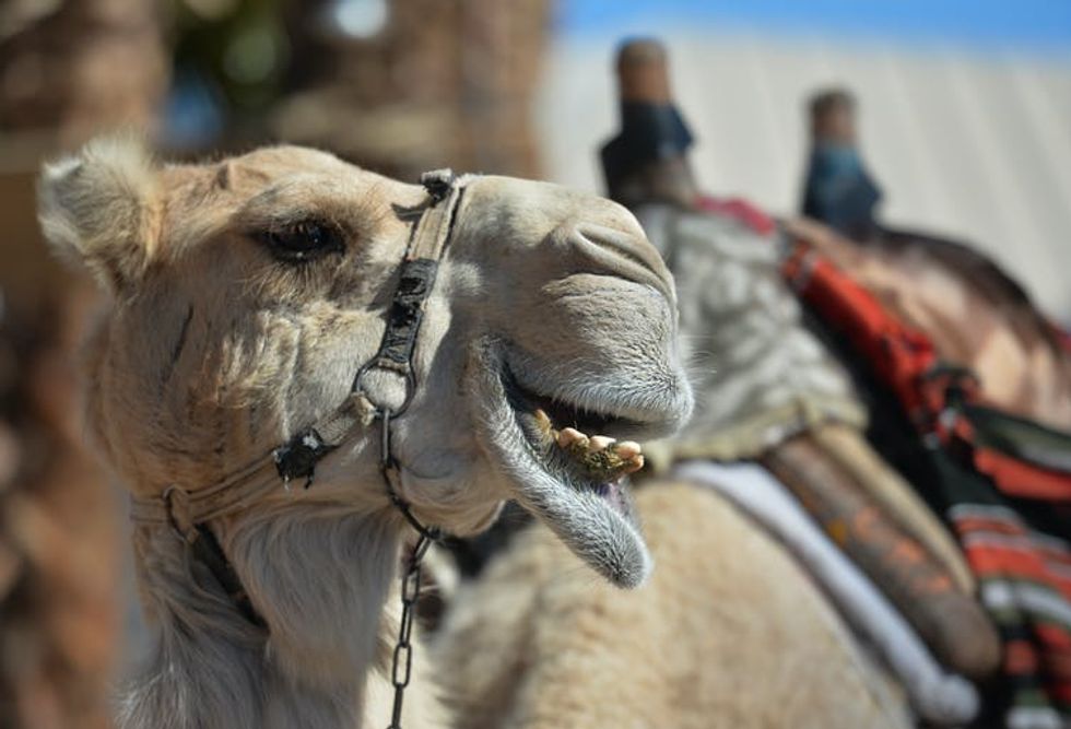A camel at the entrance to the Underwater Observatory Marine Park aquarium in the Israeli resort city of Eilat on Feb. 1, 2020. Camels are considered to have been a source of infection in MERS.