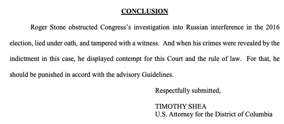 "Roger Stone obstructed Congress' investigation into Russian interference in the 2016 election, lied under oath, and tampered with a witness. And when his crimes were revealed by the indictment in this case, he displayed contempt for this Court and the rule of law. For that, he should be punished in accord with the advisory Guidelines," prosecutors wrote.
