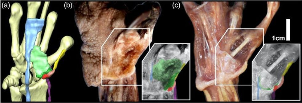 Dissections were performed to analyse the anatomy of the hand and wrist. A seventh specimen was used to create a digital reconstruction of these anatomical structures following MRI scanning and manual segmentation – a technique similar to a medical scan that allows the anatomy to be viewed in three-dimensions in a digital space.