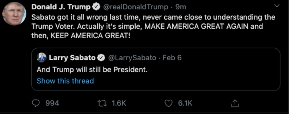 "Sabato got it all wrong last time, never came close to understanding the Trump Voter. Actually it’s simple, MAKE AMERICA GREAT AGAIN and then, KEEP AMERICA GREAT!"