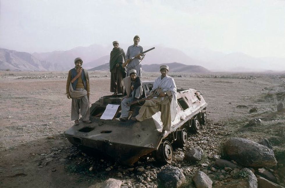 Afghan rebels on top of knocked out Russian armored vehicle in Afghanistan in February 1980.