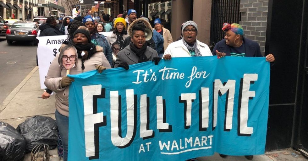 "We're here taking on the billionaires who are destroying our economy and our democracy," said Melissa Love, a United for Respect member and Walmart associate who attended the protest. "Now with the unveiling of the Great Workplace, we see Walmart quietly eliminating more full-time positions. It's time for the Waltons and Walmart CEO [Doug] McMillon to stop hoarding company profits to enrich themselves through share buybacks."
