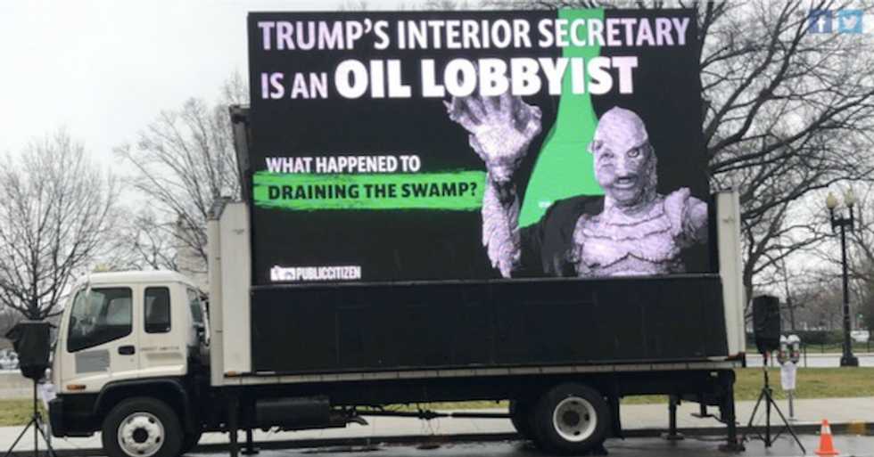 As activists and experts descended on the U.S. Department of the Interior building in Washington, D.C. Tuesday for a public forum and rally about the Trump administration's recent attack on one of the nation's landmark environmental laws, the advocacy group Public Citizen parked a truck with a massive screen nearby to play a video of a top official morphing into a "swamp monster" on loop for eight hours.