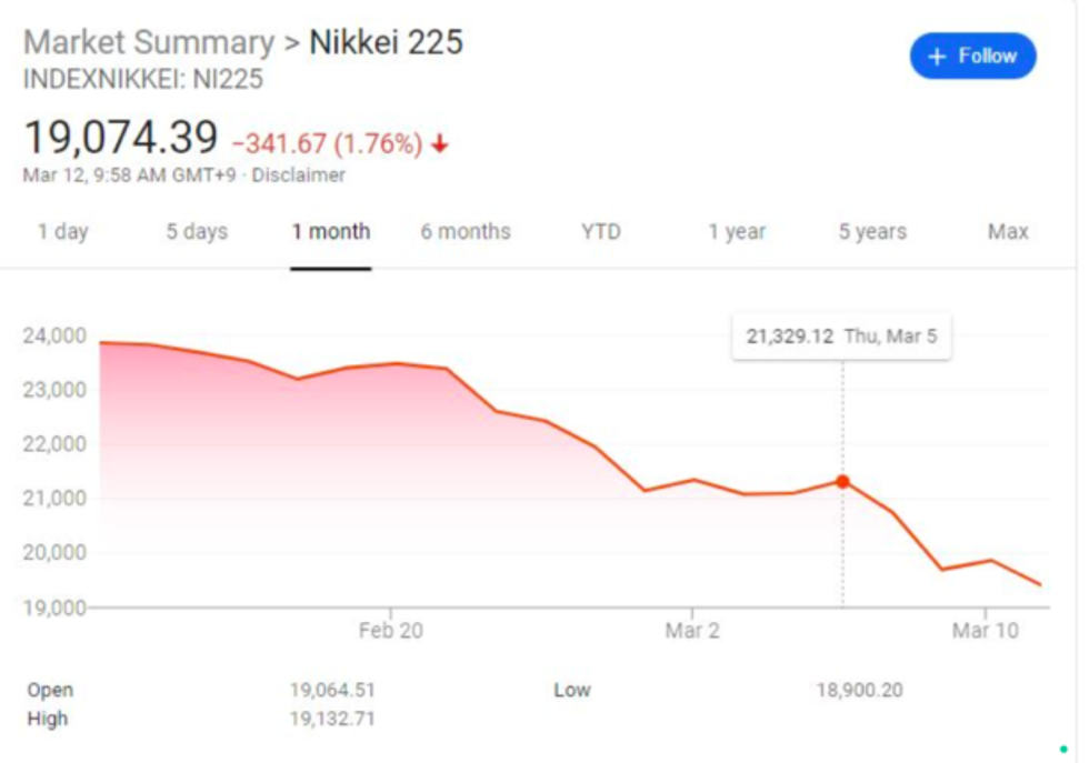 The Nikkei Index, the Japanese markets, also took a dive as Trump spoke, though their numbers have been down since it opened and the U.S. Dow closed in "bear market" territory.
