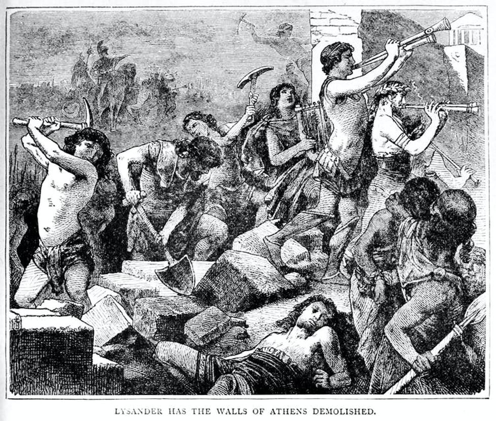 The Spartan general Lysander orders the walls of Athens be destroyed, as part of the Athenian capitulation to Sparta.