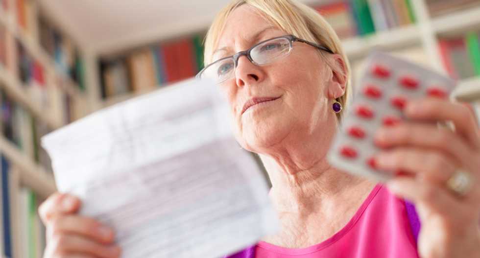 Elderly woman with medicine and reading drug prescription. (Shutterstock)