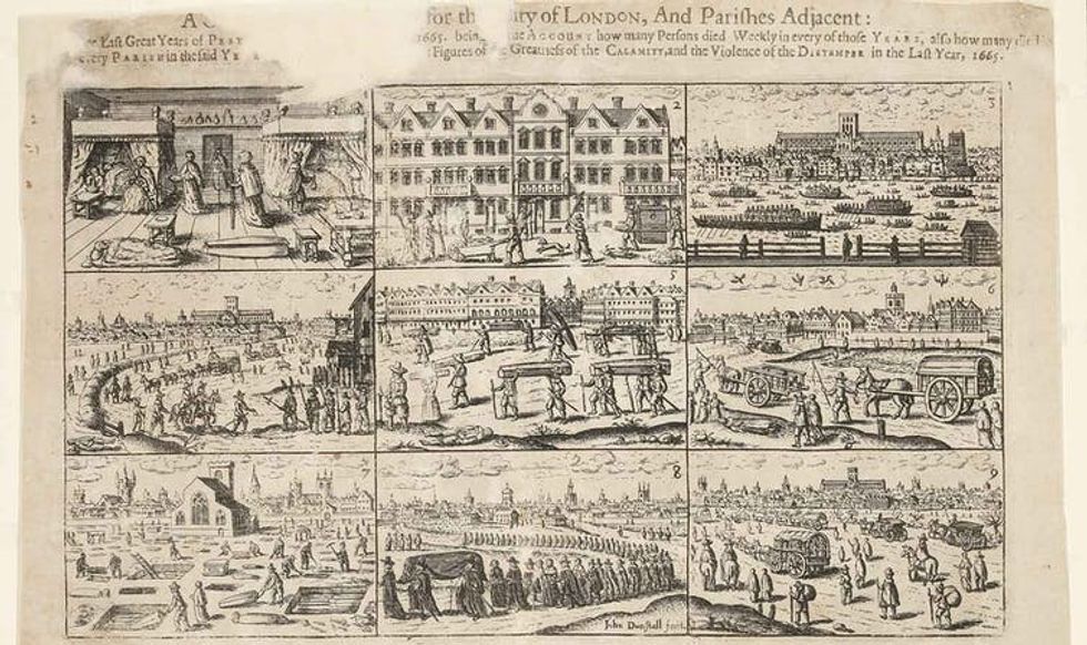 A 1666 engraving by John Dunstall depicts deaths and burials in London during the bubonic plague.