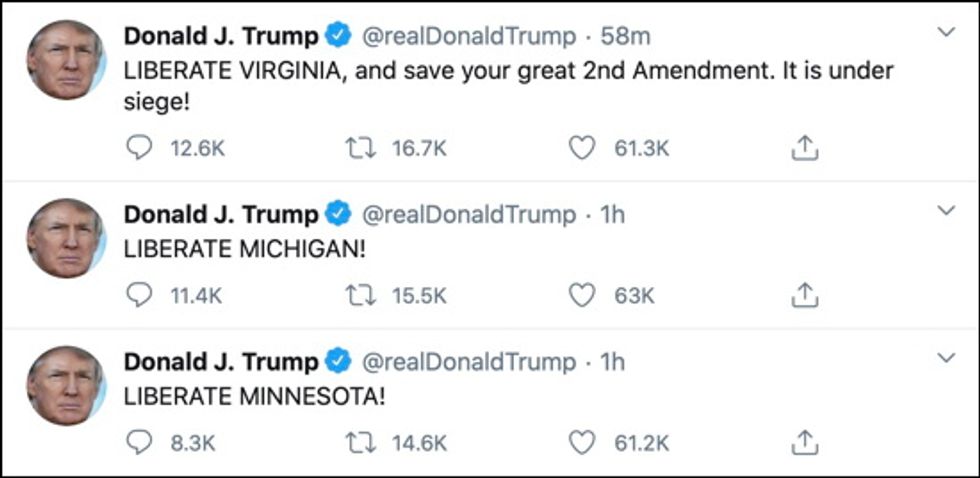 In that context, it’s not at all unreasonable to consider Trump’s tweets about “liberation” as at least tacit encouragement to citizens to take up arms against duly elected state officials of the party opposite his own, in response to sometimes unpopular but legally issued stay-at-home orders.