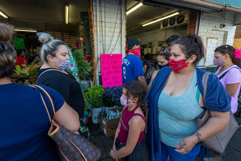 California has allowed some retail businesses to reopen, including car dealerships, clothing stores and bookstores. Here, people appear to pass close in the flower district of Los Angeles.