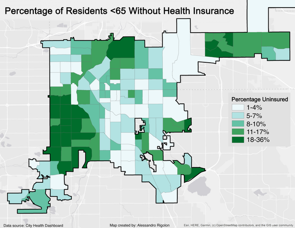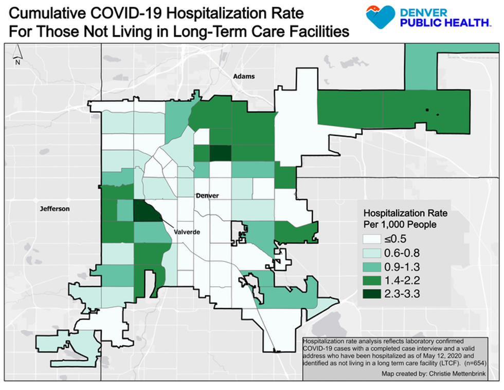 In Denver, neighborhood maps also reveal other influences. For example, maps of COVID-19 hospitalizations overlap with maps showing lack of health insurance and access to preventive medical care.